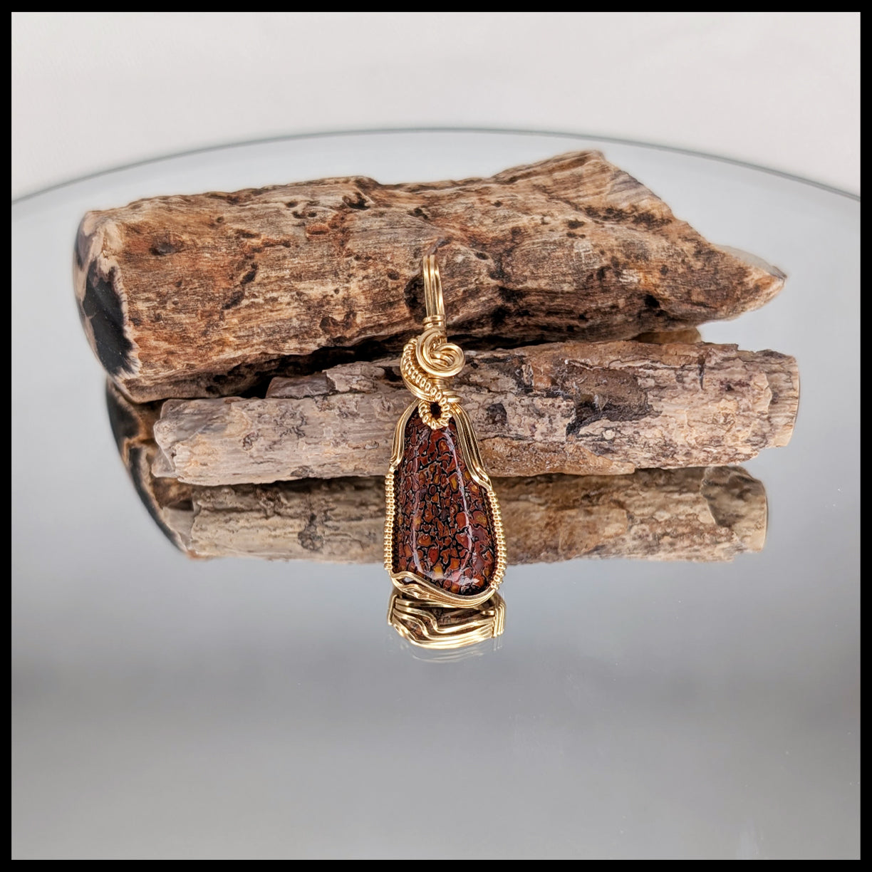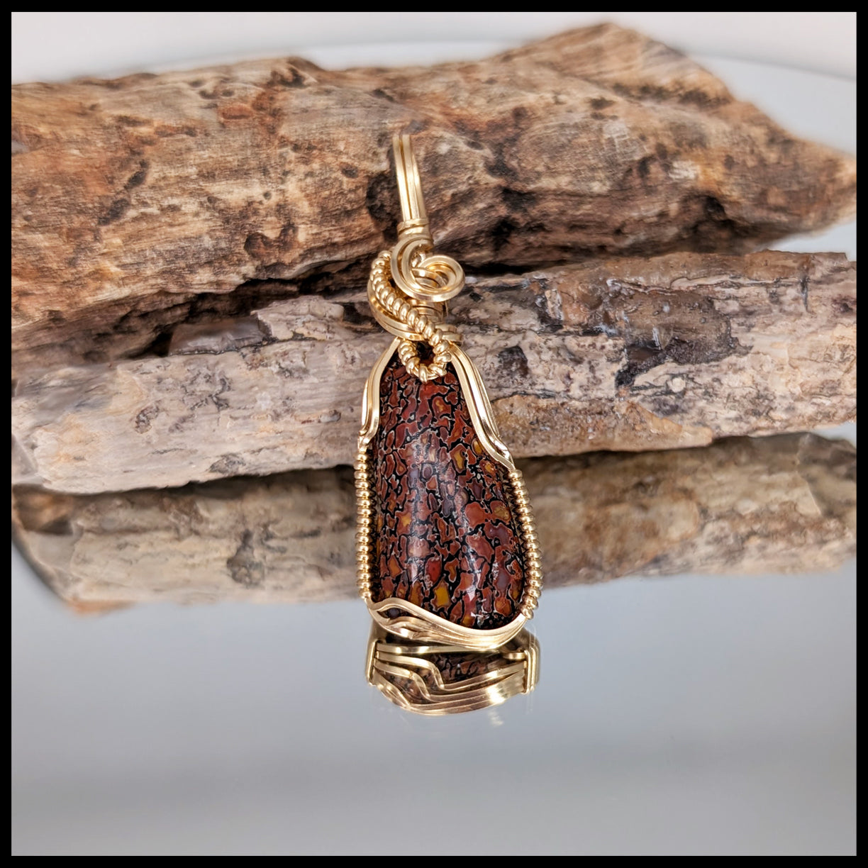 This pendant was handcrafted by jewelry artist and designer Jennifer Damrow. It features a cut and polished cabochon of fossil Dinosaur Bone, also called Gembone. It shows dark orange and red coloring with black patterning. Wire-wrapped with 14kt gold-filled wire. silver.