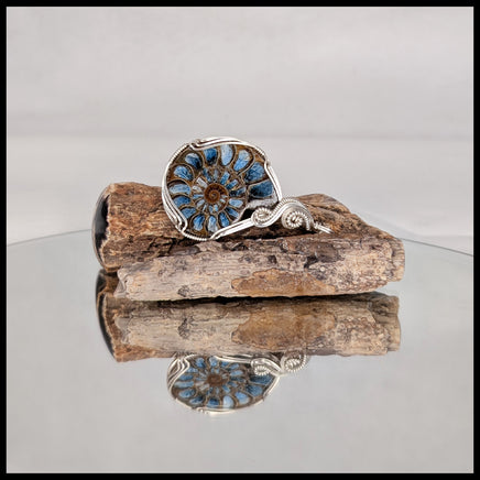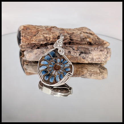 This pendant was handcrafted by jewelry artist and designer Jennifer Damrow. It features a cut and polished Ammonite fossil inlayed with Blue Ice Glacierite, which is a beautiful and accidental byproduct of industrial smelting from Indonesia. Wire-wrapped with Argentium Sterling Silver, which is slightly more durable, tarnish-resistant, and hypoallergenic than typical 92.5 sterling silver.