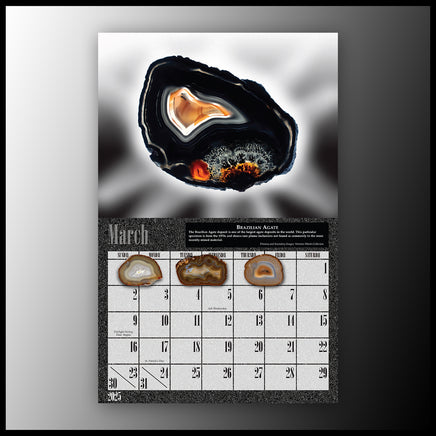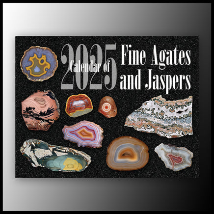 This beautiful, limited edition, calendar features twelve 8.5 "x 11" full-colored photographs of exceptional collector specimens of agates and jaspers including; Brazilian Agate, Laguna Agate, Ocean Jasper, Dinosaur Bone, Petrified Wood, Condor Agate, Dryhead Agate, and more.