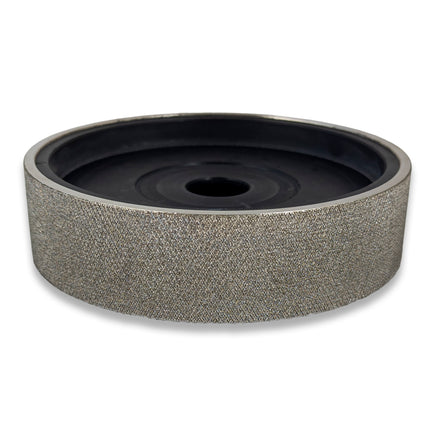 Johnson Brothers Lapidary brand. A 1.5" wide, 6" diameter metal grinding wheel for a 1" diameter arbor. Good for middle stages of grinding cabochons or small specimens and removing bumps from the curve of the stone.