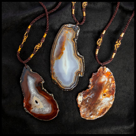 This necklace has an agate pendant on either a black or brown braided cord. The cord has a slidable section in the back for length adjustment and ease of taking on and off, and knotted accents in either mahogany red (on the black cord) or golden yellow (on the brown cord).