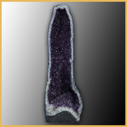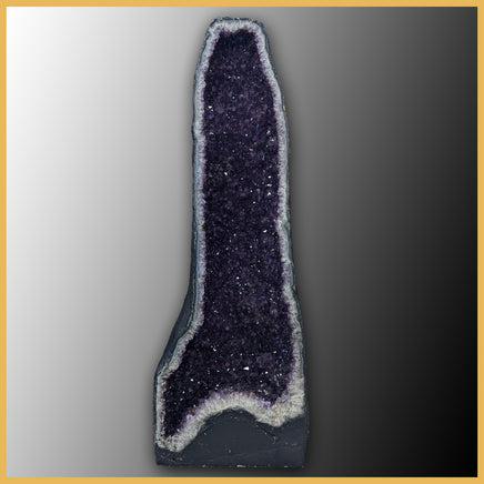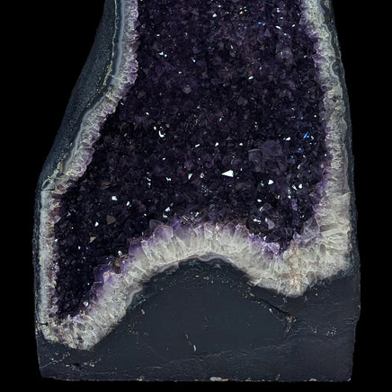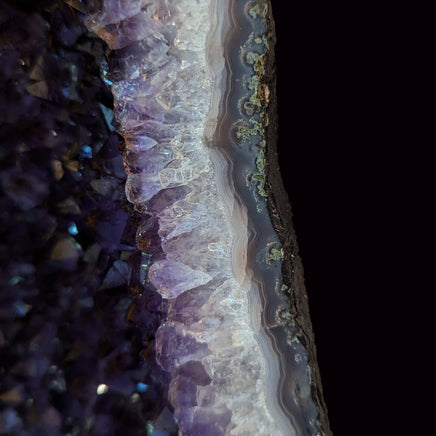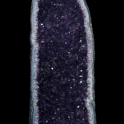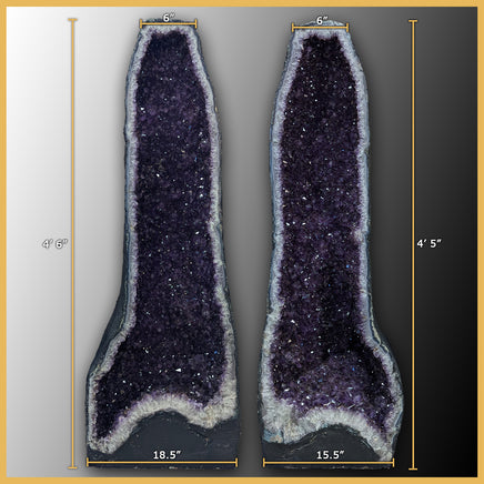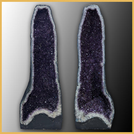 This large cathedral pair comes from Brazil and has thick flat bases, polished faces, and impressively dark purple crystals. The geode crust is lined in blue and white banded agate with some spots of green mossy formations poking in from the edges. The chalcedony then turns into quartz crystals and the natural gradient of white to deep purple on each amethyst crystal is visible. Throughout both cathedrals are tiny, visible, golden colored iron inclusions sitting within the crystals. They sit within the deepest parts of the purple and outline the crystal layers within.