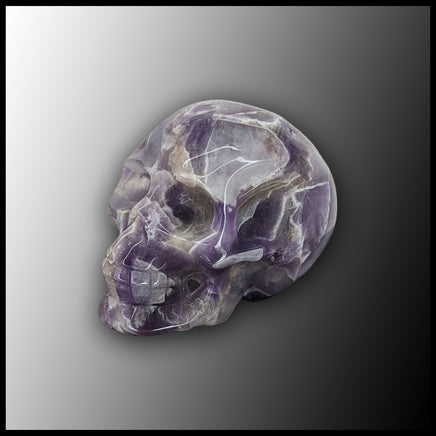 Polished skull carved from Amethyst in varying shades of purple quartz with potential white chevrons or golden brown inclusions.