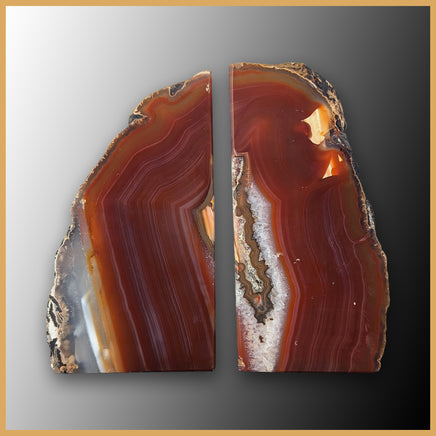 Made from a cut and polished Brazilian Agate nodule, this pair of bookends features heat treated agate in deep oranges and red with water-level banding and a quartz center.