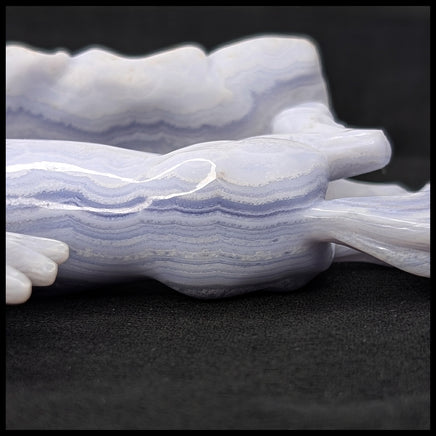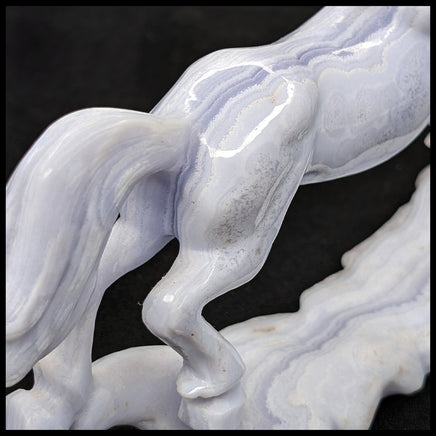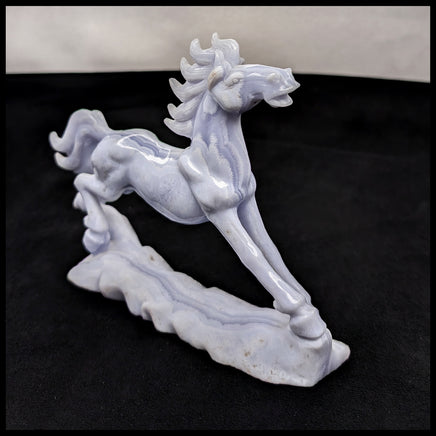 This carving of Blue Lace Agate shows a horse in a gallop over a base of ocean waves. It shows beautiful light gemmy blue agate with lacey banding, speckled chalcedony, or clear crystal sections. The horse itself is polished while the base contrasts in a smooth matte finish. The hooves, face, main, and tail have quality details and the waves at the bottom add the perfect touch of movement and balance to the piece overall.