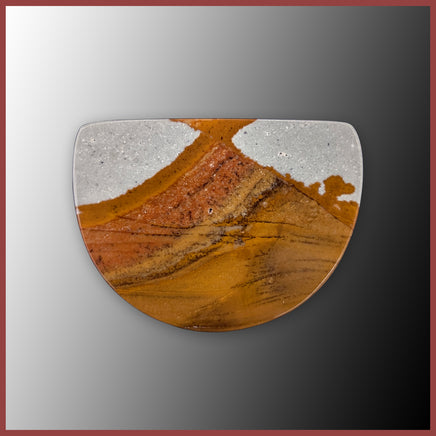 Blue Mustang Picture Jasper is mined by The Gem Shop in southeast Oregon. This polished cabochon features a golden brown landscape with red and darker brown patterning, with a pale blue-gray sky.