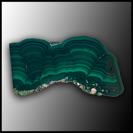 Malachite is a secondary copper mineral normally found in Africa. It has beautiful bright and deep green colors with intricate banding and botryoidal patterns. This slab is polished on both sides, with one cut edge. The chemical formula for malachite is Cu₂CO₃(OH)₂.