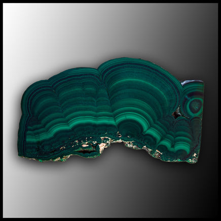 Malachite is a secondary copper mineral normally found in Africa. It has beautiful bright and deep green colors with intricate banding and botryoidal patterns. This slab is polished on both sides, with one cut edge. The chemical formula for malachite is Cu₂CO₃(OH)₂.