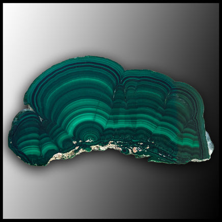 Malachite is a secondary copper mineral normally found in Africa. It has beautiful bright and deep green colors with intricate banding and botryoidal patterns. This slab is polished on both sides. The chemical formula for malachite is Cu₂CO₃(OH)₂.