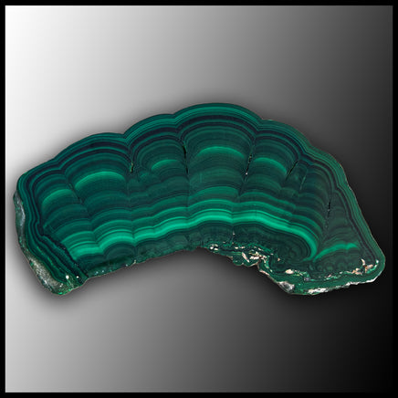 Malachite is a secondary copper mineral normally found in Africa. It has beautiful bright and deep green colors with intricate banding and botryoidal patterns. This slab is polished on both sides. The chemical formula for malachite is Cu₂CO₃(OH)₂.