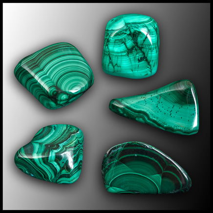 Malachite is a copper carbonate mineral with beautiful bright and deep green colors with intricate banding and botryoidal patterns. These are large tumble-polished specimens with exceptional patterning on each piece. The chemical formula for malachite is Cu₂CO₃(OH)₂.