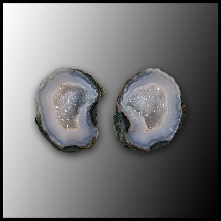 This is a polished geode pair featuring light blue and pink agate and druzy.