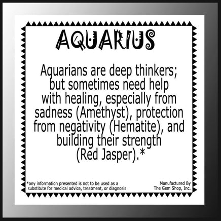 The card states: "Aquarians are deep thinkers; but sometimes need help with healing, especially from sadness (Amethyst), protection from negativity (Hematite), and building their strength (Red Jasper)."