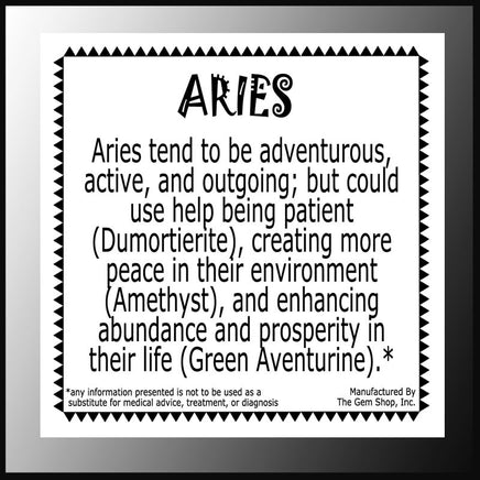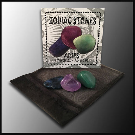 Contains a black pouch with 3 stones and a description card specifically designed for Aries. The three stones for Aries are Dumortierite, Amethyst, and Green Aventurine. Aries birthdates are March 21 - April 19.