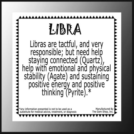 The card states: "Libras are tactful, and very responsible; but need help staying connected (Quartz), help with emotional and physical stability (Agate) and sustaining positive energy and positive thinking (Pyrite)."