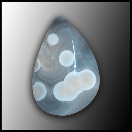 Botswana Agate polished cabochon featuring rare eye formations in white over gray gently banded agate.