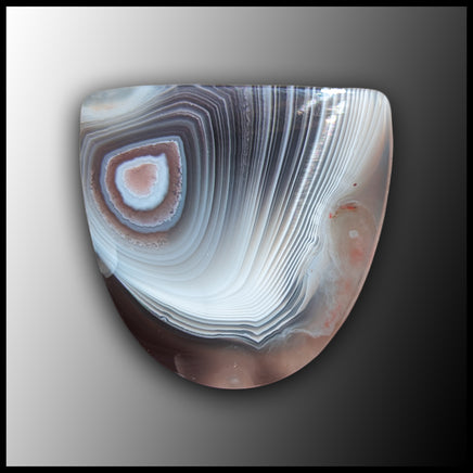 Botswana Agate polished cabochon featuring white, gray, tan, and translucent banded agate with parallax.