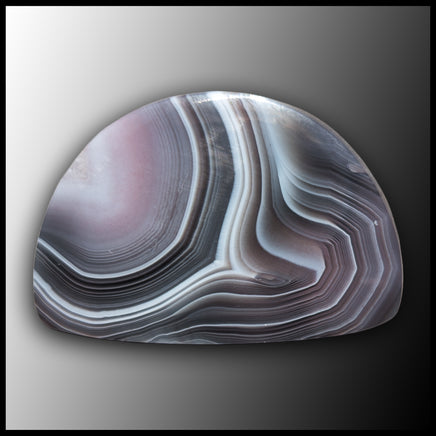 Botswana Agate polished cabochon featuring white, gray, and mauve banded agate with strong parallax.