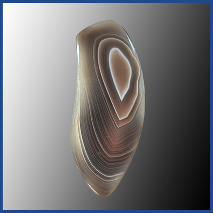 A white, grey, brown, pink, and black Botswana Agate cabochon with a polished face and edges.