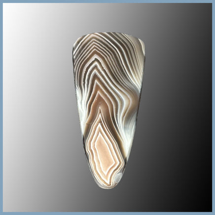 Botswana Agate Cabochon with white, grey, pink, brown, and black banded agate with a polished face and edges as well as visual parallax.