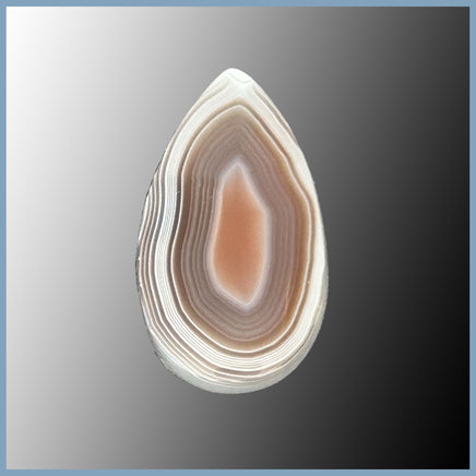 Botswana Agate Cabochon with white, grey, and pink banded agate with a polished face and edges as well as visual parallax.