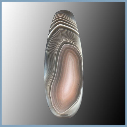 Botswana Agate Cabochon with white, grey, pink, and brown banded agate with a polished face and edges as well as visual parallax.