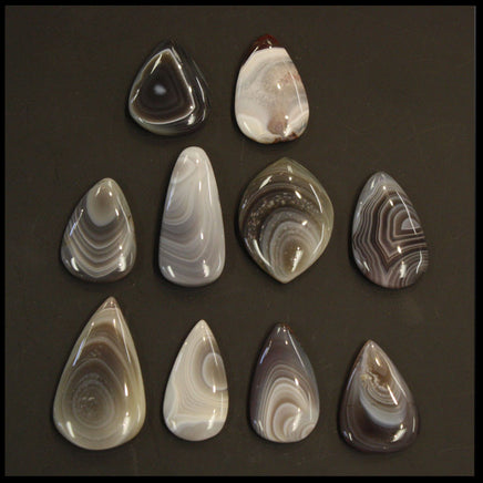 BOTSET701c Botswana Agate Cabochon Lot features 10 cabochons. The cabochons are approximately 30mm x 20mm, and display a variety of colors and shapes.