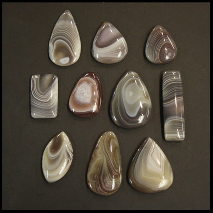 BOTSET710c Botswana Agate Cabochon Lot features 10 cabochons. The cabochons are approximately 30mm x 20mm, and display a variety of colors and shapes.