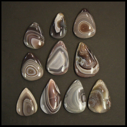 BOTSET716c Botswana Agate Cabochon Lot features 10 cabochons. The cabochons are approximately 30mm x 20mm, and display a variety of colors and shapes.