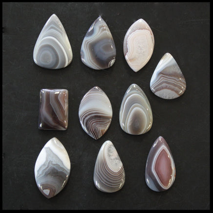 BOTSET720c Botswana Agate Cabochon Lot features 10 cabochons. The cabochons are approximately 30mm x 20mm, and display a variety of colors and shapes.