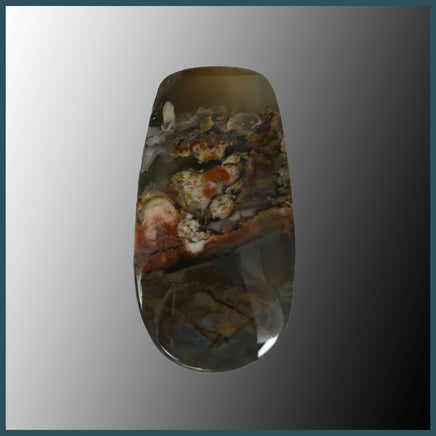 Polished Butterfly Jasper Cabochon with blue, green, red, and white jasper and a patch of clear agate.