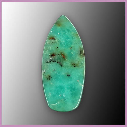 Australian Chrysoprase polished cabochon in bright, gemmy, blueish green, with specks of dark brown.