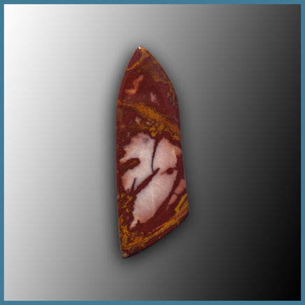Damu Jasper polished freeform cabochon featuring dark red, dark golden yellow, and pale pink jasper.