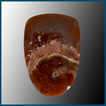 Polished Flame Agate Cabochon with red, white, pink, and orange plumes in clear/grey agate.