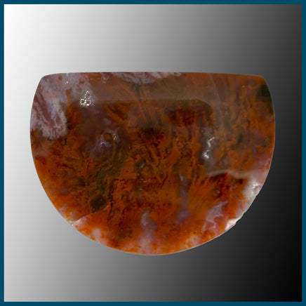 Polished Flame Agate Cabochon with red, blueish/purple, and orange plumes in clear/grey agate with a couple small druzy pockets.