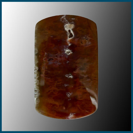 Polished Flame Agate Cabochon with red, and orange plumes in clear/grey agate with a white inclusion on the left side, and a couple small druzy pockets.