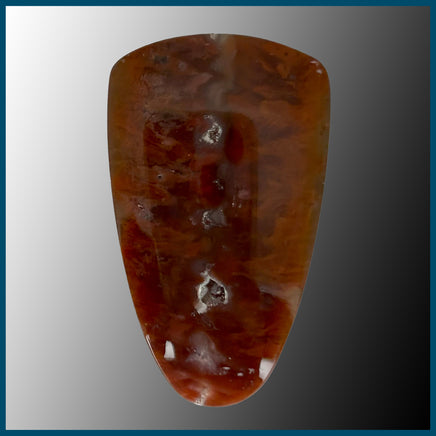 Polished Flame Agate Cabochon with red, and orange plumes in clear/grey agate as well as a couple small druzy pockets.