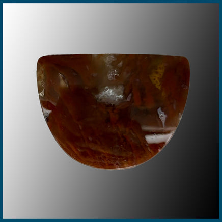 Polished Flame Agate Cabochon with red, and orange plumes in clear/grey agate as well as a couple small druzy pockets.