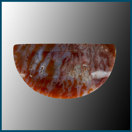 Polished Flame Agate Cabochon with red, and orange plumes in light blue agate.