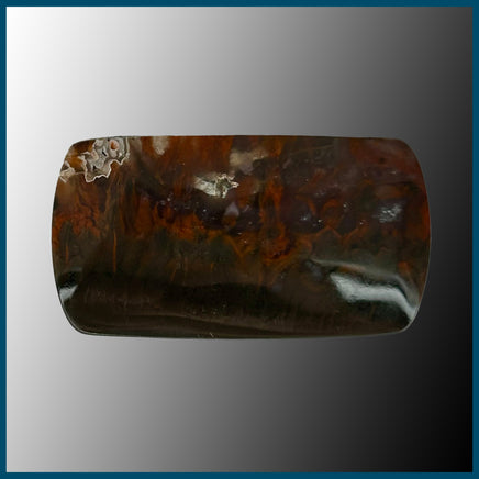 Polished Flame Agate Cabochon with red, black, and orange plumes in clear/grey agate with a couple white inclusions.