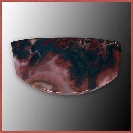 Idaho Sunset comes from central Idaho, and shows saturated chalcedony that is sometimes opaque jasper and sometimes translucent agate. This polished cabochon features painterly patterns in dark green, dark red, reddish-orange, dusty pinks, and tan.