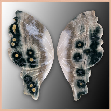 These wings are carved by hand by skilled artisans as designer pieces for jewelry use. Carved from Ocean Jasper®, this pair of butterfly wings has a flat back and is fully polished. They show white, tan, and dark green chalcedony with yellow spherulites and a bit of light blue.