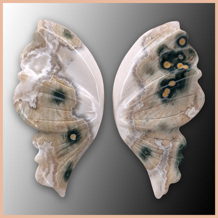 These wings are carved by hand by skilled artisans as designer pieces for jewelry use. Carved from Ocean Jasper®, this pair of butterfly wings has a flat back and is fully polished. They show opaque white, tan, and green chalcedony with yellow spherulites, and a spot of white druzy.
