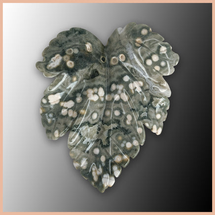 These leaves are carved by hand by skilled artisans as designer pieces for jewelry use. Carved from Ocean Jasper®, this leaf is formed in a delicate, three-dimensional curve and is fully polished. It features white spherulites (orbs) in sage green chalcedony.