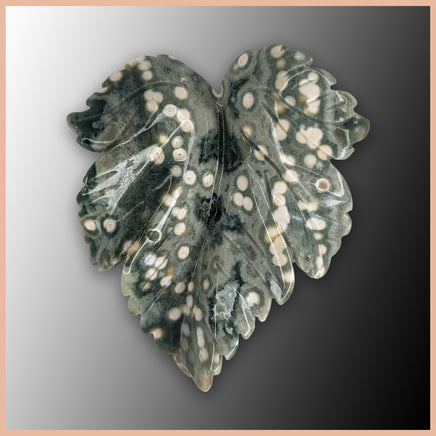 These leaves are carved by hand by skilled artisans as designer pieces for jewelry use. Carved from Ocean Jasper®, this leaf is formed in a delicate, three-dimensional curve and is fully polished. It features white spherulites (orbs) in sage and dark green chalcedony.