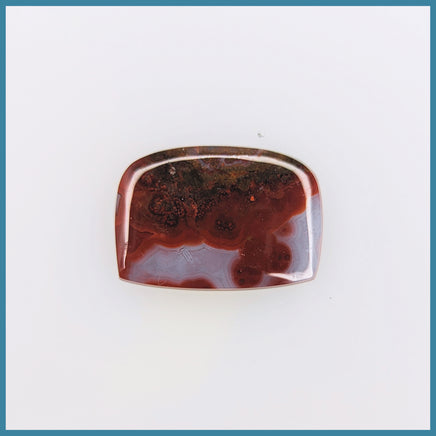 Moroccan Agate polished cabochon featuring brown and bright red mossy patterning with blue-gray banding sections, and a polished back.