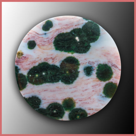 Ocean Jasper® polished cabochon featuring white, pale yellow, and pink jasper with orbicular patterning in dark green.