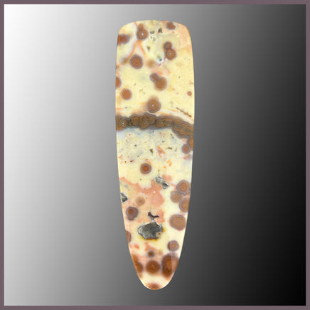 Ocean Jasper® polished cabochon featuring white, pale yellow, a little bit of green, and pink jasper with orbicular patterning in orange, and red.
