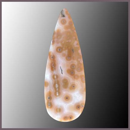 Ocean Jasper® polished cabochon featuring white, orange, and pink jasper with orbicular patterning in orange, and blue/black.