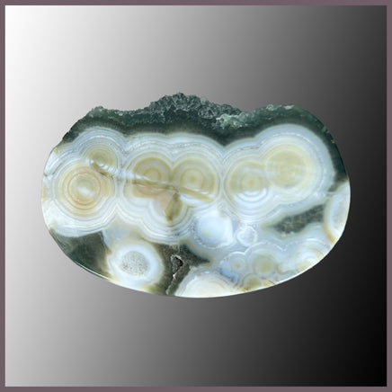 Ocean Jasper® polished cabochon featuring white, pale yellow, and green jasper with orbicular patterning in yellow as well as a druzy covered top edge.